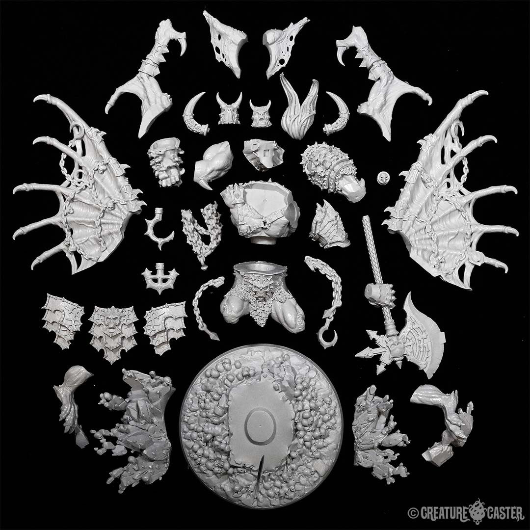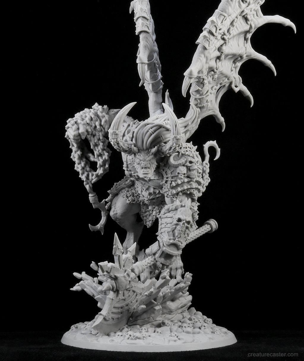 The King of Onslaught is a pinnacle of Creature Caster achievement. Finely detailed armour covers this miniature, complete with heavy plates, and intricate skull-mail. His monstrous axe crushes the ground, giving him a unique and dynamic pose that maintains incredible stability and strength. Pieces slot together tightly and easily, and come pre-marked for magnetization or pinning purposes. This is one epic brute that brings a terrifying majesty to the tabletop.